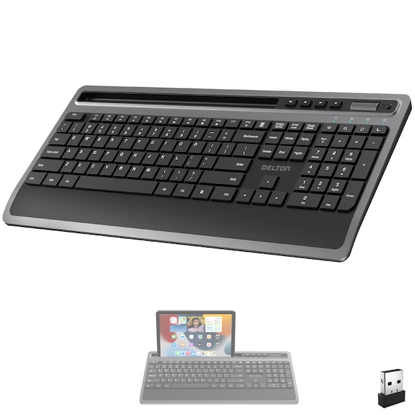 Ergonomic Design for Enhanced Typing ComfortOur Delton T42 wireless keyboard for laptop is thoughtfully crafted to provide exceptional comfort during extended typing sessions. Featuring a full-sized, 114-key layout with a Numpad, it promotes a natural hand position, significantly reducing discomfort during prolonged use. Perfect for professionals, and writers, this ergonomic design cordless keyboard boosts overall typing efficiency.Seamless Wireless Connectivity and Streamlined Media ControlEnjoy exceptional stability with our advanced 2.4GHz quiet wireless keyboard, offering a range of up to 30 feet for unrestricted movement. This reliable connection ensures that your keystrokes are transmitted instantly, providing a smooth typing experience.Our wireless keyboard with number pad features 12 dedicated multimedia keys, allowing for quick and easy access to essential media controls. This full-sized quiet keyboard includes buttons for Play/Pause, Stop, Track Navigation, Volume Control, My Computer, Search, and Refresh.Efficient Power Management and Versatile Compatibility This usb wireless keyboard is equipped with an auto power saver that activates after 10 minutes of inactivity, maximizing battery life. The instant wake-up function of our ergonomic keyboard wireless allows you to resume typing instantly by simply pressing any button. Operating on a single AAA battery not included, this computer keyboard wireless ensures a dependable and efficient typing experience.Featuring wide compatibility, this full size wireless keyboard works with a range of devices, including PCs, laptops, and tablet PCs. Our usb keyboard wireless integrates seamlessly with various operating systems like Windows, iOS, macOS, and Linux, ensuring flexibility for gaming, working, or browsing.