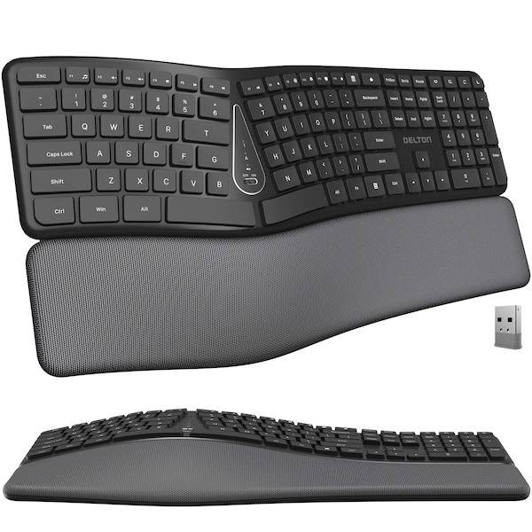 Ergonomic Comfort for Enhanced TypingRevolutionize your workspace with Delton KB250 wireless keyboard ergonomics, equipped with an ergonomic design that reduces strain on wrists and hands during long periods of use. Endorsed by rheumatologists, this silent wireless keyboard features a wrist-friendly design, ensuring exceptional support for a comfortable typing experience. This wireless computer keyboards comes equipped with a plush, pillowed wrist rest, enhancing typing posture. Streamlined Typing Experience & Enhanced connectivityFeaturing a full-sized layout, our wireless keyboard with dongle provides easy access to all necessary keys for seamless typing and navigation. This computer keyboards wireless integrated full numpad and dedicated multimedia shortcuts enhance efficiency across various tasks, from quick calculations to effortless media control. Experience peaceful typing with our ergonomic keyboard, boasting meticulously engineered keys that ensure minimal noise. This ergonomic split keyboard includes a 2.4 GHz auto-pair USB dongle for a reliable connection.Comfortable and Efficient Split Keyboard with WristPad Our curved wireless keyboard comes with a wrist pad for extended comfort during long periods of use, providing additional support. It features a full size wireless keyboard with a 111 key layout, ensuring all the keys you need for efficient typing and navigation are readily available. Designed with productivity in mind, this split computer keyboard allows you to work efficiently and comfortably for extended periods on just 2AA batteries. Whether you need a computer keyboard wireless option or something ergonomic, this product delivers on all fronts.After 10 minutes of inactivity, the curved keyboard intuitively activates its energy-saving mode, ensuring efficient power management. Enjoy uninterrupted typing sessions with wireless keyboard quiet, extended usage, and wireless keyboard quiet soft keys, eliminating the hassle of frequent recharging or battery replacements.