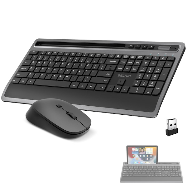 Productivity-Boosting ComboEnhance your productivity with Delton T42/M42 wireless keyboard and mouse combo, designed for long-lasting comfort. The full size keyboard includes a numpad for efficient typing, while the mouse provides a comfortable, natural grip. Together, they help reduce strain and improve your overall typing and navigation, ensuring seamless performance.Streamlined Multimedia Control and Effortless Wireless PrecisionOur T42 quiet wireless keyboard mouse combo features 12 dedicated multimedia keys, offering quick access to functions like Play/Pause, Stop, Previous/Next Track, a Volume Up/Down wheel, My Computer, Search, and Refresh. Boasting 6 premium buttons, including left/right click, forward/backward controls, and a DPI switch, combined with a smooth scroll wheel, this M42 wireless mouse for laptop delivers precise navigation and seamless control.Experience exceptional connectivity with our usb keyboard and mouse combo, featuring advanced 2.4GHz technology for a stable connection up to 30 feet. The mouse also offers three adjustable DPI settings 800, 1200, and 1600, enabling you to fine-tune sensitivity for precise control and optimal performance with every task.Efficient Power Management & Universal Device CompatibilityThis laptop keyboard and mouse set features an auto power-saving function that activates after 10 minutes of inactivity, enhancing battery life for prolonged use. The handy instant wake-up function allows you to quickly resume typing by clicking any button. Our usb wireless keyboard ergonomic is designed for seamless compatibility with a wide range of devices, including PCs, laptops, and tablet PCs. Our wireless mouse and keyboard combo support various operating systems, such as Windows, iOS, macOS, and Linux, offering versatility for every user.