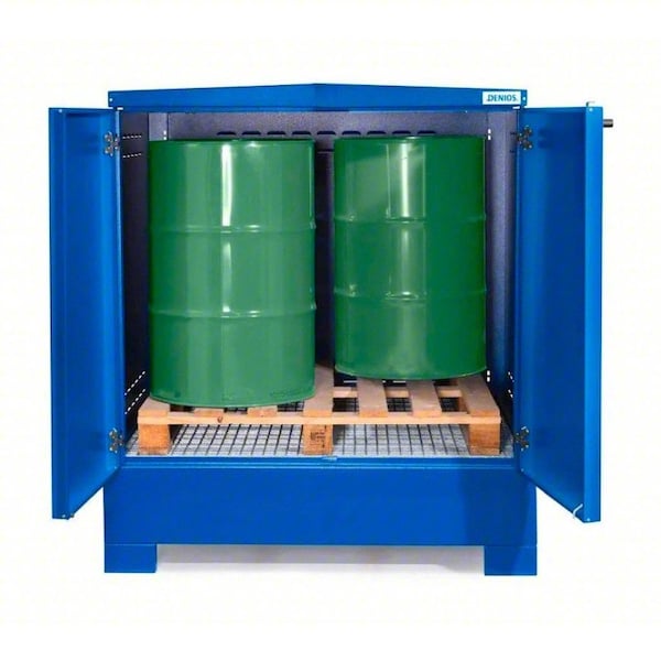 Hazmat Safety Locker, Color Blue, Door Closure Type Manual, Door Handle Type L-Handle, Door Opening Height 41 15/16 in, Door Opening Width 54 in, Door Type Hinged, Drum Capacity 4, Drum Storage Orientation Vertical, Exterior Depth 57 in, Exterior Height 58 in, Exterior Width 54 in, FM Class Not Applicable