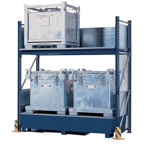 IBC Storage Rack and Sump, Color Blue, Dimensions 126 in x 55 in x 120 in, Finish Painted, Includes (2) Beams, (4) Uprights, Sump, Indoor/Outdoor Use Indoor, Load Capacity, lb. 20,000 lb, Manufacturer Warranty 1 yr, Number of IBC Totes 4, Number of Shelves 2, Overall Depth 55 in, Overall Height 120 in, Overall Width 55 in, Rack Material Steel, Recycled Content ( Percent) No Recycled Content, Spill Capacity, gal. 385 gal, Supports EPA Compliance 40 CFR 264.175, Supports NPDES Compliance Yes