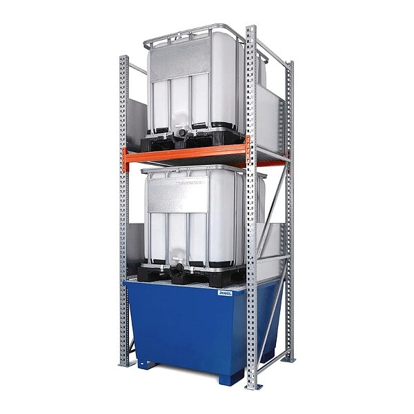 IBC Storage Rack, Color Blue, Composition Painted Steel; Powder Coated, Dimensions 66 in W x 55 in D x 144 in H, Finish Painted, Powder Coated, Footplates 55 in x 66 in, Load Capacity, lb. 10,000 lb, Load Capacity per Shelf, lb. 5,000 lb, Number of IBC Totes 2, Number of Shelves 2, Overall Depth 55 in, Overall Height 144 in, Overall Width 66 in, Rack Material Steel, Spill Capacity, gal. 385 gal, Supports NPDES Compliance Yes, Supports SPCC Compliance Yes