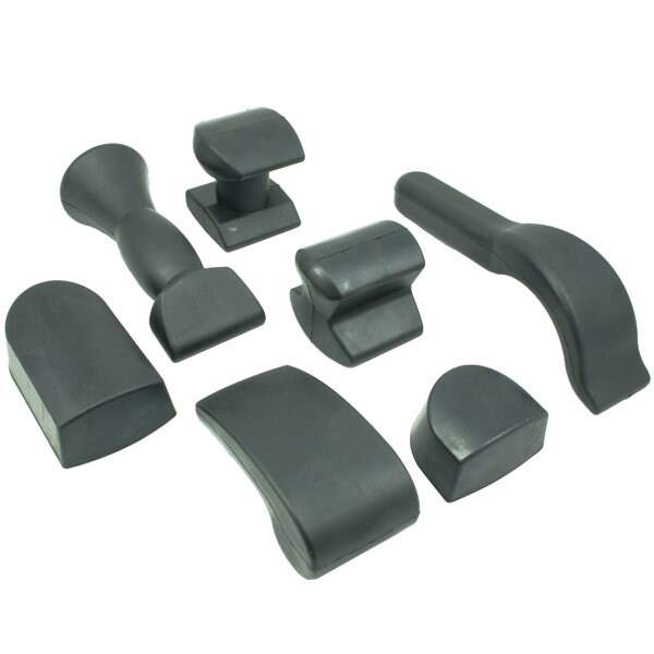 The DF-AB711 seven piece Rubberized Dolly Set has less bounce back than steel dollies. The steel core in each dolly has a dense rubber covering that absorbs the harsh impacts. Works perfectly for aluminum and steel work