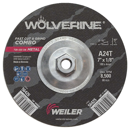 Cutting Wheel, Type 27, 7 in Dia, 0.125 in Thick, 5/8 in-11 UNC Nut Arbor Hole Size, Aluminum Oxide