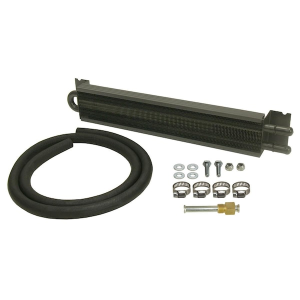 Derale provides electric fans belt driven fans fluid coolers and other promotional materials. Our products are of high quality that suits even the most demanding users. With the same 1/2in copper tubing expanded into aluminum cooling fins this cooler uses a slim design to enable frame mounting in limited space applications. This kit with a complete transmission cooler hardware kit to easily install onto vehicles with 5/16in transmission cooler lines. Perfect for light-duty use and occasional light towing. Features -Prevents heat related transmission failures -Extends life of transmission -Improves transmission performance -Extruded plastic cooling fin guards -2 pass cooler design -1/2in copper tubing expanded into aluminum cooling fins Specifications - Cooler Style: Tube & Fin - Construction: Copper tube and aluminum fin - Inlet Size: 11/32in barb - Inlet Diameter: 1-1/4in - Mounting: 15-1/2in - Core Length: 13-3/4in - Hose Length: 4ft - Inlets Size: 0.34in - Size: 17in - Dimension: 2-5/8in W x 16-3/4in L x 1-3/4in D