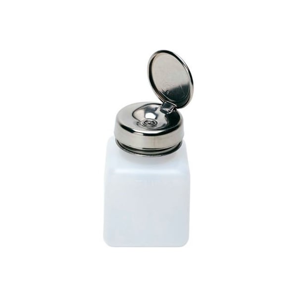 Menda 35305 square natural hdpe liquid dispenser with one-touch pump, 4 oz. this menda one-touch stainless steel pump dispenser comes with a natural hdpe semi-opaque white 4 oz. Bottle. The semi-opaque bottle allows easy viewing of bottle contents and is designed with a square shape for convenient storage. One-touch pumps are a convenient one-handed indish-stylein liquid dispensers and dispense approximately 0.2 ml of liquid with a single touch of the pump top. Try them with acetone, nail polish remover, make-up remover, astringents, alcohol, hdpe compatible solvents and more. Menda pumps are proudly for superior quality.