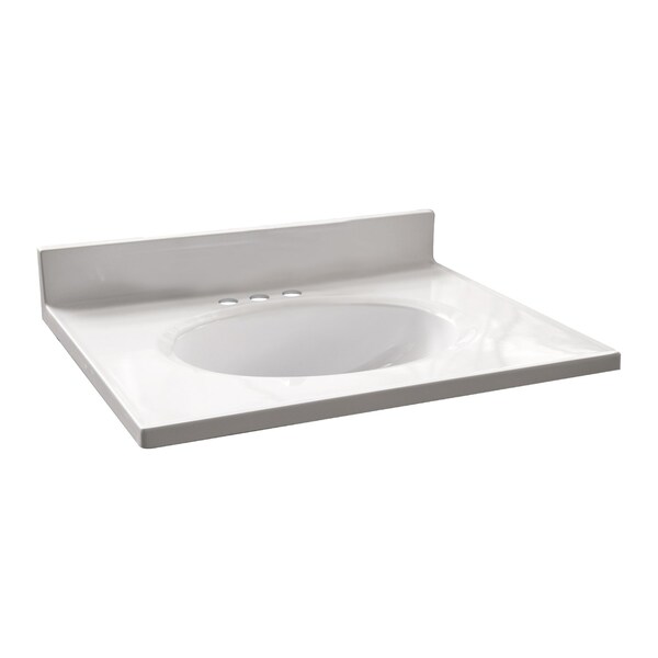 Give your bathroom that clean, classic look you’ve been searching for with the Design House 25” Cultured Marble Vanity Top with solid white finish. This versatile top features a drip free edge to help contain excess water and squared edges that evoke a more modern look. Three pre-drilled holes make installing a 4” centerset faucet easy and an integrated backsplash creates a barrier between your wall and the vanity to help prevent mold and water damage. The oval bowl at the heart of this top is integrated directly into the design for a seamless look. The Cultured Marble Vanity Top comes with a 5-year limited warranty that protects against defects in materials and workmanship.