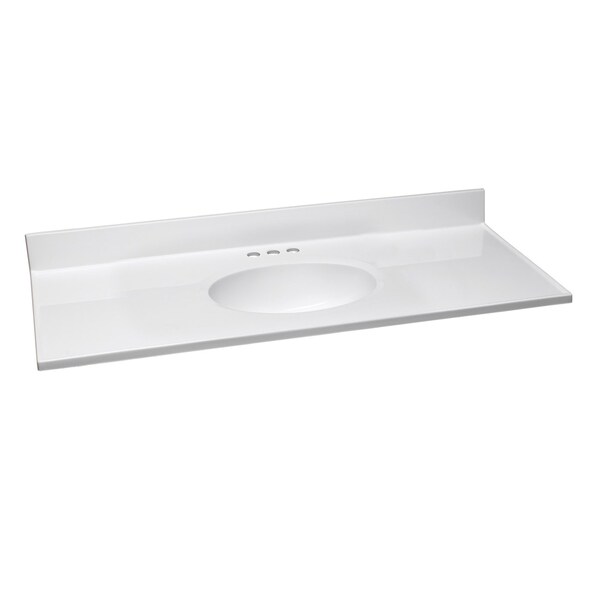 Give your bathroom that clean, classic look you’ve been searching for with the Design House 49” Cultured Marble Vanity Top with solid white finish. This spacious top features a drip free edge to help contain excess water and squared edges that evoke a more modern look. Three pre-drilled holes make installing a 4” centerset faucet easy and an integrated backsplash creates a barrier between your wall and the vanity to help prevent mold and water damage. The oval bowl at the heart of this top is integrated directly into the design for a seamless look.