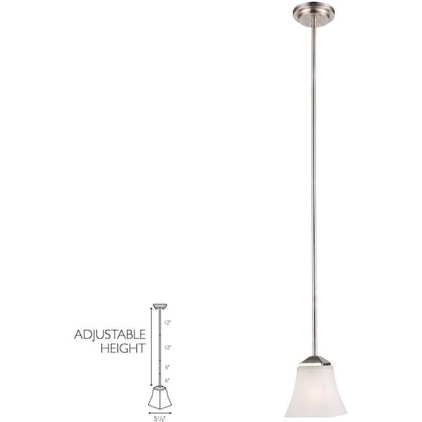 A balanced mix of elegance and simplicity, this versatile pendant light easily blends with traditional or contemporary home interiors. Made from a metal base and rod, this fixture features a frosted white glass shade with a tulip-shaped design that displays a downward facing bulb. Use the adjustable lengths of downrod for optimal task or ambient lighting.Ideal for kitchens, bar areas, islands, bathrooms, hallways and more, this traditional mini pendant has a satin nickel finish with a tulip-shaped frosted white glass shadeDimensions: 44 in. H x 5.25 in. WDimmable: designed to be dimmable when used with a compatible dimmer switch not included, allowing you to adjust the preferred light brightnessAdjustable height: includes two 12 in. stems and two 6 in. items which can be assembled at varying lengths depending on space available and preferenceUses one 60-Watt medium base bulb or LED equivalent not included, hardwired power source with mounting hardware includedETL listed for safe use in damp locations10-year limited warranty