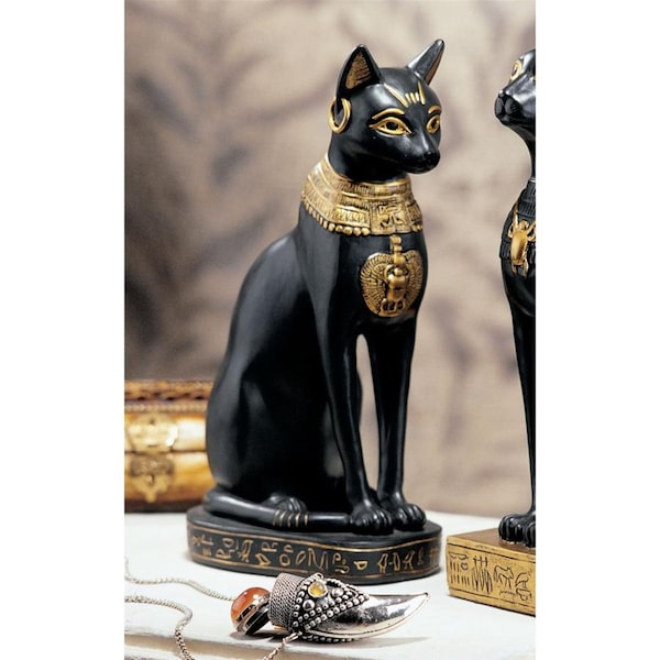 Bastet, the Egyptian Cat Goddess, was said to protect women and children, as well as to guard the sun's power to ripen crops. Our museum-quality sculpture with scarab pendants and earrings, is crafted of quality designer resin in a matte black finish and set on a detailed base scribed with hieroglyphics. Approx. 3"Wx4"Dx8"H. 2 lbs.