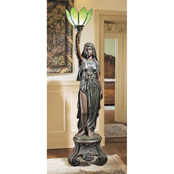 Eight curved stained glass petals illuminate the night with floral splendor, held aloft by this braided and bejeweled neoclassical maiden of light. Demanding attention at 61⁄2 feet tall atop her traditional scrolled plinth, this near life-size classic sculpture with flowing tresses and sweeping gown is cast in quality designer resin with a faux verdigris bronze finish. Our Toscano-exclusive, 360-degree work is a true investment in furniture art. Includes pedal switch and accepts your 60-watt bulb. 26"Wx241⁄2"Dx78"H. 106 lbs.