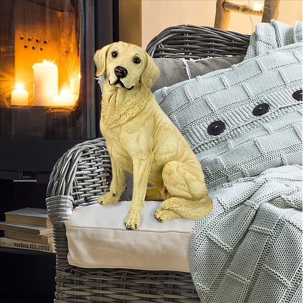 Our amazingly life-like Golden Labrador Retriever dog sculpture has neither a bark nor a bite worth worrying over! Whether staking out your garden or guarding your TV remote, our Golden Labrador Retriever dog figurine will add adorable character and canine charm to home or garden. This Design Toscano quality designer resin exclusive is hand-painted with realistic markings that'll make garden guests do a double-take. Our Golden Labrador Retriever dog statue is for the discriminating dog lover and makes the perfect gift for any canine aficionado. 9"Wx9"Dx151⁄2"H. 2 lbs.
