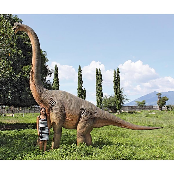 The Brachiosaurus (arm reptile) was one of the tallest and largest dinosaurs ever found. Weighing nearly 80 tons, its front legs were taller than the back legs. The long, enormous neck, resembling a modern day giraffe, allowed the Brachiosaurus the height advantage to alarm other dinosaurs such as Apatosaurus and Stegosaurus to oncoming danger from Jurassic predators. The life span of the average Brachiosaurus was about 100 years, this is thought because contemporary carnivores were too small to bring down a full-grown Brachiosaurus. Our prehistoric replica dinosaur statue is cast in quality designer resin, reinforced for supreme strength with fiberglass and hand-painted with powerfully convincing color and texture to be as faithful as possible to the form of its ancient species. Our Design Toscano-exclusive, display-quality giant dinosaur sculpture transforms any home, garden, restaurant or hotel into something truly magnificent! Another breathtaking dinosaur statue from Toscano! Design Toscano features a Special Order service; this item will be made to order for you. 2151⁄2"Wx411⁄2"Dx186"H. 314 lbs.