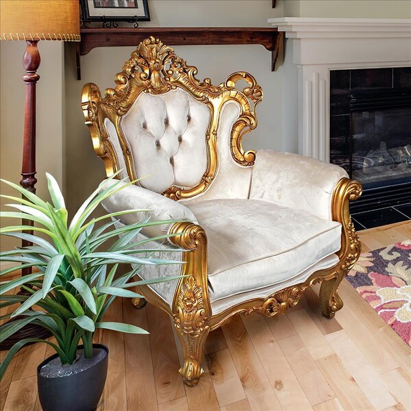 Picture curling up with a good book in the wide-seated comfort of our plush, Design Toscano-exclusive armchair! Deeply hand-carved, pierced ornamentation plays across the solid, hardwood, deep gold-finished back, legs and apron that requires a master carver a full week to complete. Creamy velvet upholstery finishes the front, tufted back and wide, scrolled arms while showcasing the medallion crown. 38"Wx36"Dx49"H. 75 lbs.