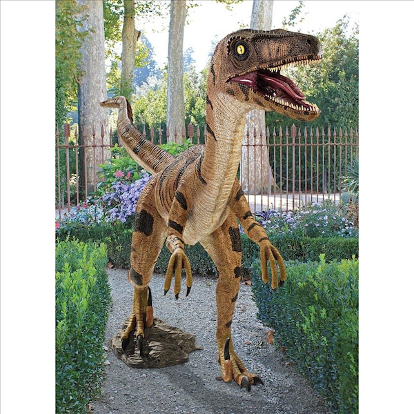 Even if he wasn't 5-feet tall and coined by a name that means speedy thief, we're guessing this muscular menace on two legs would still be hard to catch! Our Design Toscano exclusive Jurassic-sized, meat-eating prehistoric replica dinosaur statue is realistically sculpted with terrifying teeth, retracted foot claws and an S-shaped neck, then cast in quality designer resin and hand-painted with powerfully convincing color and texture as faithful to the ancient species as possible. This large-scale, display-quality sculpture transforms any home, garden, restaurant or hotel into something truly magnificent! 106"Wx24"Dx62"H. 103 lbs.