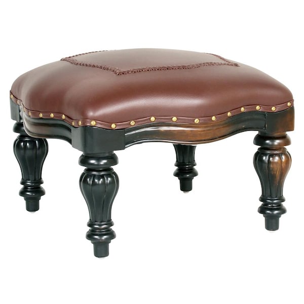 We can't remember if we were first attracted by the tastefully detailed hand-carving or the tobacco-colored faux leather stretched on the dark mahogany, comfortable frame of this ottoman. Whatever the reason, we've continued to admire the detailing-Victorian curves finished front and back with braided trim and hand-carved legs. You'd usually expect to find this much deep-seated comfort only in the library of a mid-19th century English country home. 201⁄2"Wx201⁄2"Dx15"H. 13 lbs.