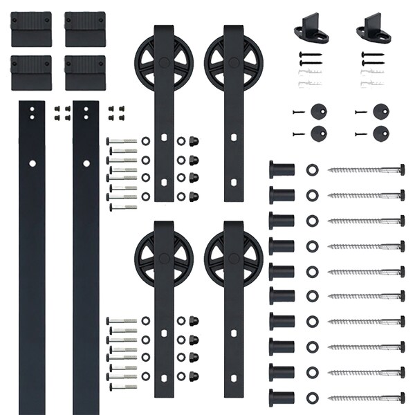 • Kit comes with all the parts needed to hang up to a standard 36 in. door, two 78 in. rail, 10 wall mounting brackets, 4 roller straps, 2 center guide, 2 rail stops and 4 anti-jump block and 5 specially designed by passing brackets (door not included)
