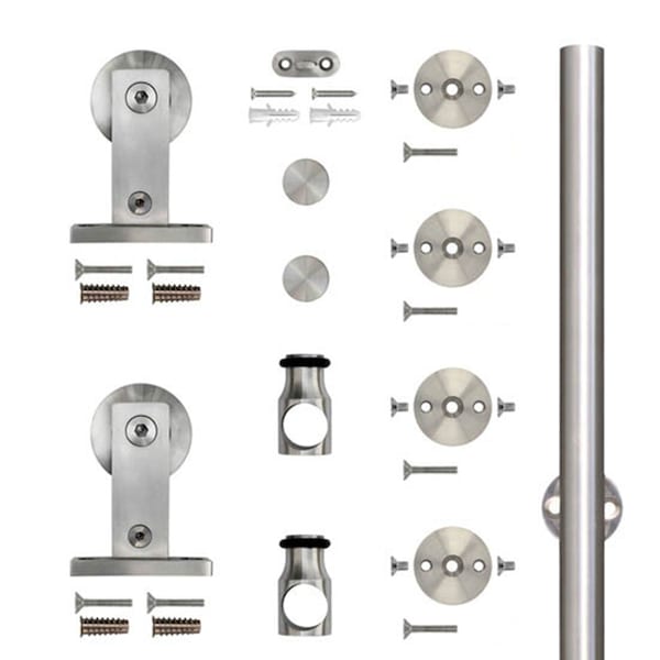 · Kit comes with the following parts: 2 door hangers, 1 - 96 in. rail, 5 mounting rail brackets, 2 end stops, 1 floor center guide, 1 spanner tool set, all hardware fasteners and instructions, door not included
