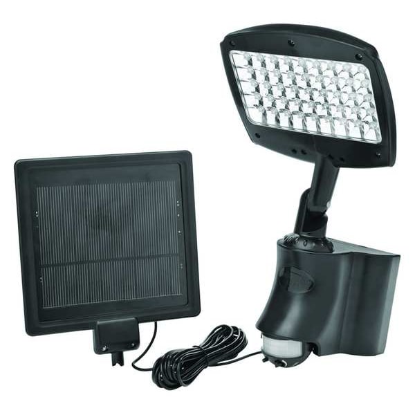 LED Solar Floodlight, Lumens 270 lm, Fixture Wattage 13.5 W, Voltage 120V AC, Light Distribution Shape NEMA 6x6, Fixture Sensor Type Motion, Fixture Mounting Location Wall, Mount Type Surface, Color Temperature 6500K, Height 5 1/2 in, Width 6 1/2 in, Suggested Lamp Item No. Not Applicable, Fixture Housing Color Black, Fixture Housing Material Plastic, Fixture Lens Material Plastic, Lumens per Watt 20 lm/W, Number of Lightheads 1, Warranty 90 Day Limited