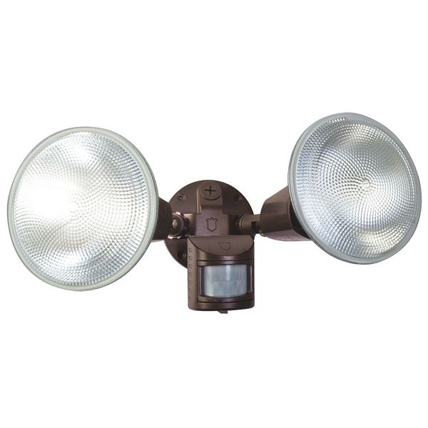 Adjustable Beam Security Light, Number of Lightheads 2, Fixture Wattage 240 W, Light Distribution Shape NEMA 5x5, Fixture Sensor Type Motion, Light Technology Incandescent, Color Temperature Not Applicable, Voltage 120V AC, Height 6 in, Width 5 in, Includes Lamp No Lamp Included, Lamp Watts 120 W, Fixture Housing Color Bronze, Fixture Housing Material Plastic, Mount Type Surface, Fixture Mounting Location Wall
