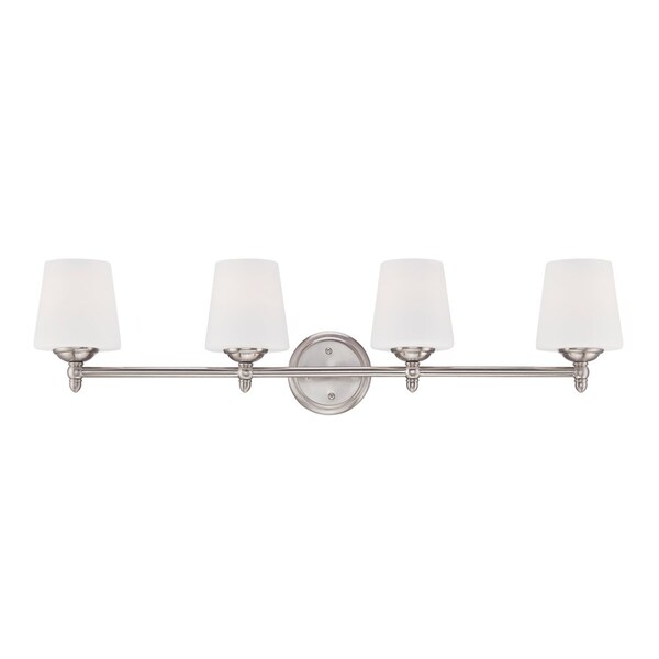 Darcy bath bars feature a clean design with sleek lines and softly molded opal glass shades, adding a touch of sophistication and modern elegance. These fixtures are built with a protective brushed nickel finish over a steel construction to look great and last for years to come. They install easily in the up or down position.