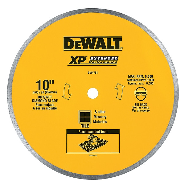Diamond Saw Blade, DEWALT(R) Series, Blade Dia. 10 in, Arbor Size 5/8 in, Arbor Shape Round, Max. Blade Speed 6,000 RPM, For Use With Saw Type Chop Saws, Cutting Type Wet, Rim Type Continuous, Max. Cutting Depth 4 in, Grade Good