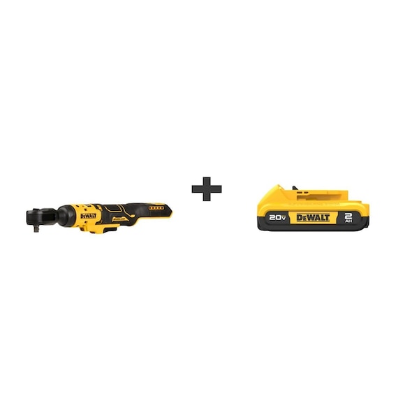 Ratchet Kit, Cordless Tool Kit Contents (1) Bare Tool; (1) Battery, Cordless, Voltage 20 V DC, Brushless Motor Yes, Fastening Torque 70 ft-lb, Free Speed 250 RPM, Drive Size 3/8 in, Head Width 1 3/16 in, Retainer Type Ball Detent, Handle Type In-Line, Number of Batteries Included 1, Battery Capacity 2.0 Ah, Battery Model No. DCB203, Battery Series 20V MAX*, Charger Included No, Charger Model Not Applicable, Case Included No, Overall Length 14 3/16 in, Wireless Tool Tracking No