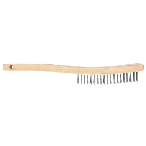 Scratch Brush, Bristle Firmness Stiff, Handle Style Curved, Bristle Material Carbon Steel, Handle Material Wood, Brush Length 1 1/8 in, Handle Length 7 in, Head Width 3 in, Bristle Color Gray, Overall Length 7 in, Brush Type Wire Scratch Brush, Head Length 1 1/8 in, Sweep Face 3 in, Grip Material Wood, FDA Compliant No, Color Coding System No