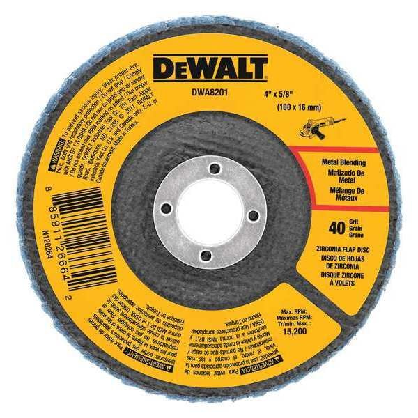 The DEWALT DWA8201 Zirconia Flap Disc is suitable for material removal in general purpose grinding applications. Featuring a 4-inch diameter and 5/8-inch connector size, this Type 29 flap disc uses zirconia abrasive material to deliver consistent performance at high speeds.
