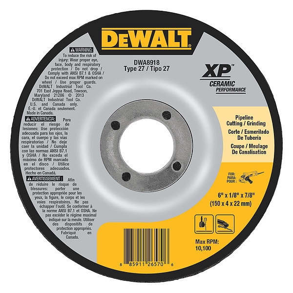 Depressed Center Wheels, Abrasive Material Ceramic, Connector Size 7/8 in, Connector Type Unthreaded Hole, Grit 24, Overall Diameter 6 in, Overall Thickness 0.125 in, Primary Material Applicationn Stainless Steel, Steel, Series XP Ceramic, Wheel Type Type 27, Maximum Operating Speed 10,100 RPM, Grade Coarse