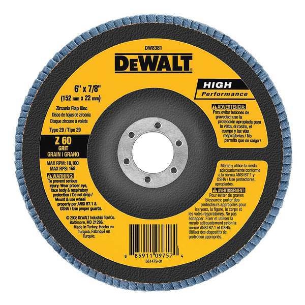 Flap Disc, Abrasive Material Zirconia Alumina, Grade Medium, Connector Size 7/8 in, Series High Performance, Backing Material Cotton, Grit 60, Maximum Operating Speed 10,100 RPM, Color Black