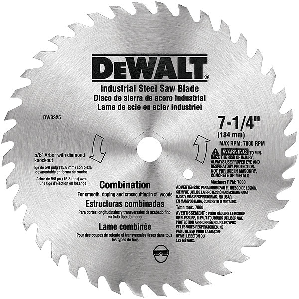 Circular Saw Blade, Series DW, Blade Dia. 7 1/4 in, Max. Blade Speed 7,000 RPM, Arbor Size 5/8 in, Arbor Shape Round, Diamond Knockout Diamond Knockout Included, Number of Teeth 40, Max. Cutting Depth 2 3/8 in, Primary Material Application Wood, Materials Cut Wood, Metal Cutting Type Not Applicable, Wood Cutting Type Combination, Cut Width 0.09 in, Tip Material Bi-Metal, Hook Angle 15 Degrees , Tooth Grind ATB, For Use With Saw Type Circular Saws, Blade Type Combination, Plate Thickness 0.05 in
