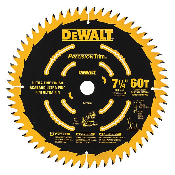 Circular Saw Blade, Series DW, Blade Dia. 7 1/4 in, Max. Blade Speed 7,000 RPM, Arbor Size 5/8 in, Arbor Shape Round, Diamond Knockout Diamond Knockout Not Included, Number of Teeth 60, Max. Cutting Depth 2 3/8 in, Primary Material Application Wood, Materials Cut Wood, Metal Cutting Type Not Applicable, Wood Cutting Type Finishing, Cut Width 0.06 in, Tip Material Carbide, Hook Angle 7 Degrees , Tooth Grind ATB, For Use With Saw Type Miter Saws, Radial Arm Saws, Table Saws, Blade Type Finishing