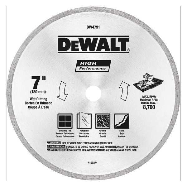 Diamond Saw Blade, DEWALT(R) Series, Blade Dia. 7 in, Arbor Size 5/8 in, Arbor Shape Round, Max. Blade Speed 8,700 RPM, For Use With Saw Type Tile Saws, Cutting Type Wet, Rim Type Segmented, Max. Cutting Depth 2 1/4 in, Materials Cut Stone, Grade Good
