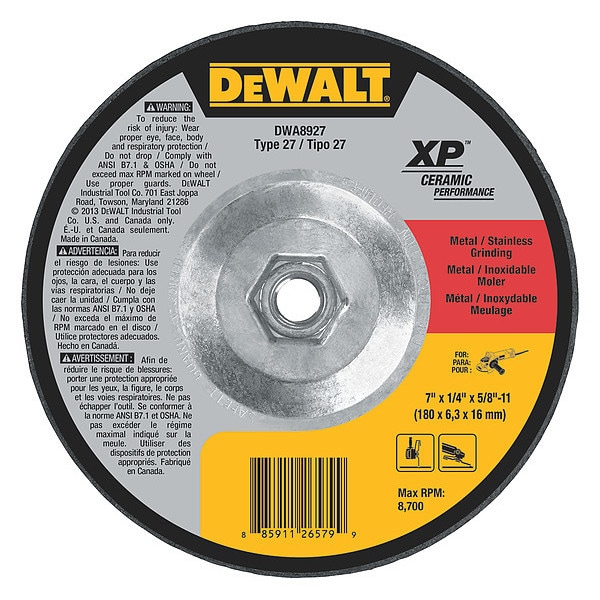 Depressed Center Wheels, Abrasive Material Ceramic, Connector Size 5/8 In.-11, Connector Type Threaded Hole, Grit 24, Overall Diameter 7 in, Overall Thickness 0.25 in, Primary Material Applicationn Stainless Steel, Steel, Series XP Ceramic, Wheel Type Type 27, Maximum Operating Speed 8,700 RPM, Grade Coarse
