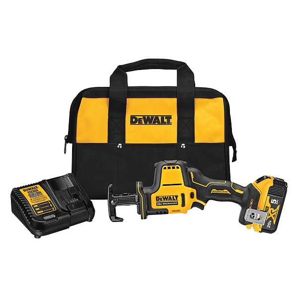 The DEWALT DCS369P1 is a cordless reciprocating saw intended for use in various applications, including operation in confined areas. Part of the ATOMICTM 20V MAX* series, this compact tool weighs only 3.13 lbs and features a brushless motor for optimized power output compared to previous models. The kit includes one 5Ah lithium-ion battery, charger, belt hook, tool bag, and two blades to support immediate use, with included components allowing the tool to be used upon receipt, following proper setup and safety instructions.