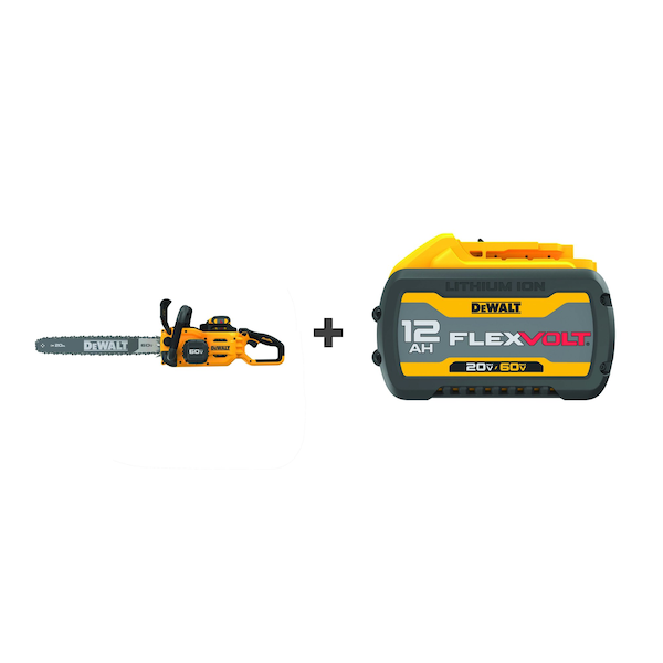 Combo Kits, Cordless Tools Included Chain Saw, Voltage 60 V DC, Power Source Cordless, Number of Tools 1, Battery Capacity 12.0 AH, Includes (1) Bar Sheath, (1) DCB115 Charger, (1) DCB615 DEWALT FLEXVOLT Battery, (1) DCB612 Battery, (1) Rugged Carrying Case, (1) Sharpening File, (1) Tensioning Tool, Tool Brand DEWALT, Battery Included DCB612, Number of Batteries Included 2, Battery Model No. DCB612, Battery Series FLEXVOLT(R), Charger DCB115, Charger Included Yes