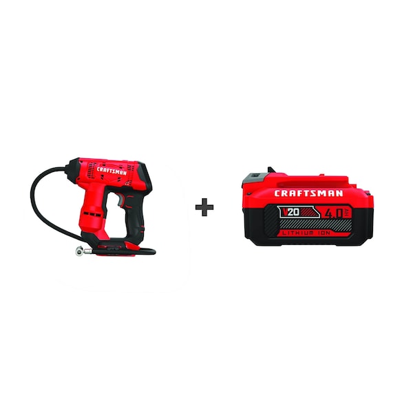 Inflator, Power Source Cordless, Battery Platform V20*, Voltage 20V DC, Battery Capacity 4.0 Ah, Number of Batteries Included 1, Maximum Air Pressure 150 psi, Minimum Air Pressure 0 psi, Hose Length 21 in, Includes CMCB204, CMCE521 High Pressure Inflator, High-Pressure Tapered Nozzle Adaptor, Inflator Needle Adaptor, Presta Valve Adaptor, Tool Weight 2.4 lb, Application Bicycle Tire; Football; Vehicle Tire, Duty Cycle Percentage Not Applicable