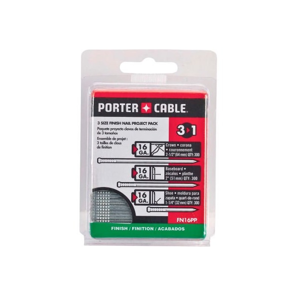 The nails in this 16 ga. Finish nail project pack feature a galvanized coating and a chisel point. It includes 3 sizes of nails (300 x 2-1/2 in., 300 x 2 in., and 300 x 1-1/4 in.) for use in a variety of applications, including crown molding, base boards, and shoe molding.