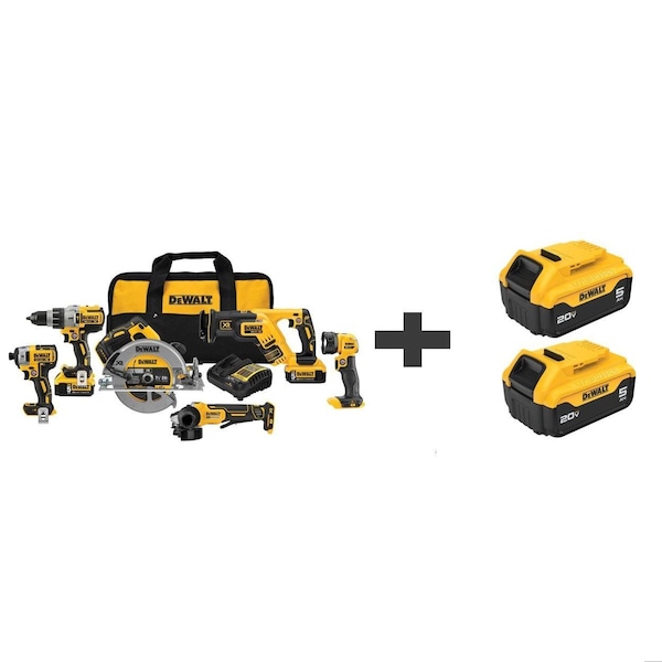 Cordless Combination Kit, Cordless Tools Included Angle Grinder, Circular Saw, Hammer Drill, Impact Driver, Light, Reciprocating Saw, Voltage 20 V DC, Power Source Cordless, Number of Tools 6, Battery Capacity (4) 5.0 Ah, Includes Charger, Contractor Bag, (4) Batteries, Tool Brand DEWALT(R), Series 20V MAX* XR, Battery Included Yes, Number of Batteries Included 4, Battery Model No. (4) Mfr. No. DCB205, Battery Series 20V MAX* XR(R), Charger (1) 11A157, Charger Included Yes