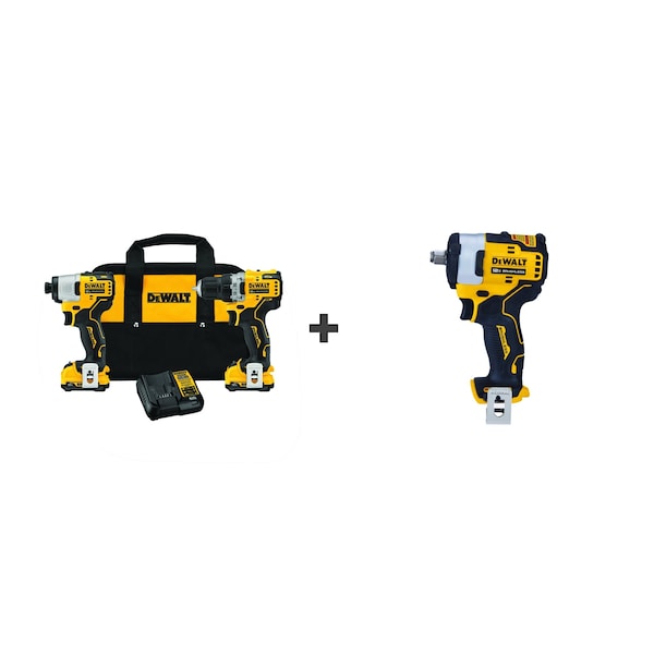 Cordless Combination Kit, Cordless Tools Included Drill, Impact Driver, Impact Wrench, Voltage 12 V DC, Power Source Cordless, Number of Tools 3, Battery Capacity 2.0 AH, Includes (2) Batteries, Charger, Tool Brand DEWALT(R), Series XTREME, Battery Included DCB122, Number of Batteries Included 2, Battery Model No. DCB122, Battery Series 12V MAX*, Charger DCB112, Charger Included Yes, Cordless Tool Kit Contents (3) Bare Tool, (2) Batteries, (1) Charger, Included Drills 3/8 in Drill/Driver