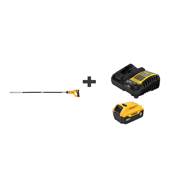 Concrete Vibrator Kit, Voltage 20V DC, Shaft Length 4 ft, Head Diameter 1 1/8 in, Radius of Vibration 4 in, Vibrations per Minute 14,000 vpm, Brushless Motor No, Cordless Tool Kit Contents (1) Bare Tool, (1) Battery, (1) Charger, Battery Capacity 5.0 Ah, Head Length 12 in, Tool Length 48 in, Battery Model Number DCB205, Battery Series 20V MAX, Charger Included Yes, Charger Model Number DCB1104, Concrete Vibrator Type Handheld, Includes Tool, DCB205, DCB1104, Number of Batteries Included 1