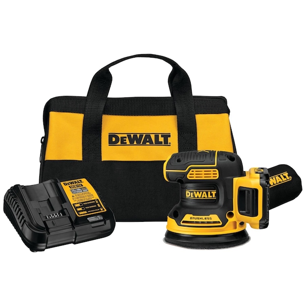 The DEWALT DCW210D1 Cordless Orbital Sander is a 20V MAX XR Series random orbital sander intended for material removal and surface preparation. This kit includes the sander, a 2.0 Ah battery, charger, dust bag, and carrying bag—providing everything needed to get started on sanding tasks without the need for cords or additional purchases.