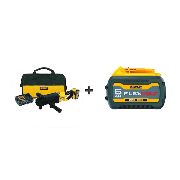 Right Angle Drill Kit, Voltage 60V DC, Battery Included, Battery Capacity (1) 6.0 Ah, (1) 9.0 Ah, Cordless Tool Battery Type Li-Ion, Brushless Motor Yes, Number of Batteries 2, FLEXVOLT Series, No Load RPM 0 to 400/0 to 1,320, Chuck Size 7/16 in Hex Quick Lock, Max. Power 2600UWO, Max. Torque Not Specified, Battery Included 53JH17, 48XP89, Handle Type Right Angle, Battery Pack Replacement 53JH17, 48XP89, Tool Length 23 51/64 in, Tool Weight 13.9 lb, Includes Side Handle, Kit Bag
