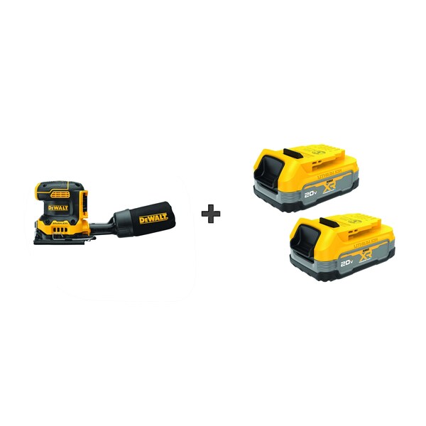Cordless Sheet Sander Kit, Power Source Cordless, Product Type Sheet Sander, Abrasive Shape Square, Sheet Size 4 1/2 x 5 1/2 in, Abrasive Mount Type Clamp, Speed Settings Variable, Battery Platform POWERSTACK, Bare Tool/Battery Included Battery Included, Number of Batteries Included 2, Battery Capacity (2) 1.7 Ah, Number of Vacuum Holes 8, Dust Collection Port Type Proprietary, Orbit Size Not Applicable, Grip Type Palm, Voltage 20 V, Battery Model Number DCBP034, Number of Chargers Included 0