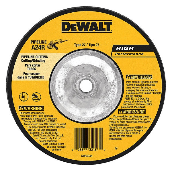 Cut-Off & Grinding Wheel, Abrasive Material Aluminum Oxide, Connector Size 5/8 In.-11, Connector Type Threaded Hole, Grit 24, Overall Diameter 6 in, Overall Thickness 0.125 in, Primary Material Application Stainless Steel, Steel, Compatible Tool Type Angle Grinder, Series A24R, Wheel Type Type 27, Maximum Operating Speed 10,100 RPM, Grade Extra Coarse