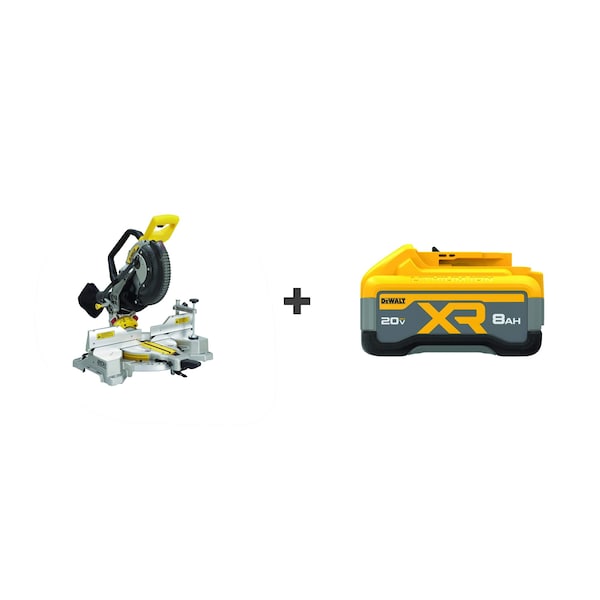 Miter Saw, Cordless, Arbor Size Not Applicable, Sliding Not Sliding, Wireless Tool Tracking Yes, Voltage 20 V DC, Battery Series 20V MAX*, Number of Batteries Included 1, Battery Capacity 8.0 Ah, Includes 10 in 32T Blade, Blade Wrench, DCB2108, DCS714 DEWALT 20V MAX* XR 10 in Double Bevel Fixed Miter Saw, Dust Bag, Material Clamp, Non-Airlock Vacuum Adapter, Stabilizer Bar, Features Cordless Compatibility, Easy Portability, Efficient Dust Collection, Large Cut Capacity, Quick Bevel Adjustments