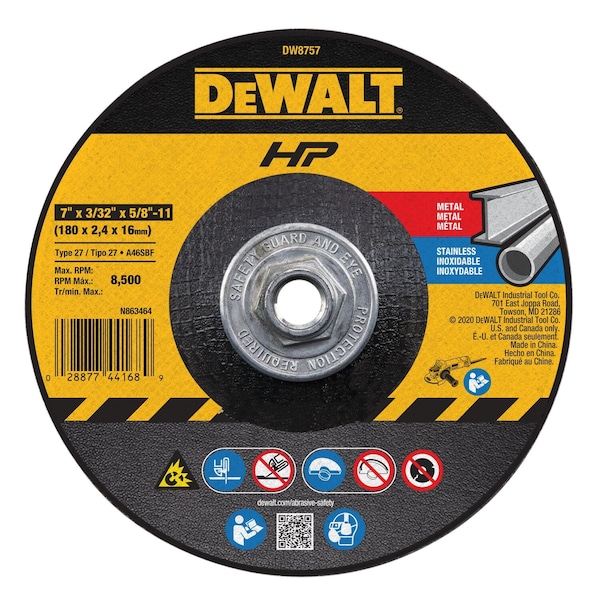 Depressed Center Cut-Off Wheel, Abrasive Material Aluminum Oxide, Connector Size 5/8 In.-11, Connector Type Threaded Hole, Grit 24, Overall Diameter 7 in, Overall Thickness 0.0938 in, Primary Material Application Stainless Steel, Steel, Compatible Tool Type Angle Grinder, Series A24R, Wheel Type Type 27, Maximum Operating Speed 8,700 RPM, Grade Extra Coarse