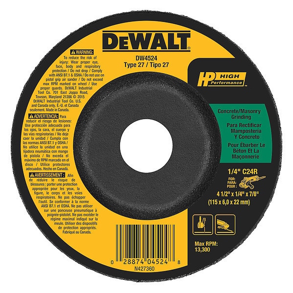 Depressed Center Grinding Wheel, Abrasive Material Silicon Carbide, Connector Size 7/8 in, Connector Type Unthreaded Hole, Grit 24, Overall Diameter 4 1/2 in, Overall Thickness 0.25 in, Primary Material Application Cast Iron, Concrete, Masonry, Compatible Tool Type Angle Grinder, Series C24R, Wheel Type Type 27, Maximum Operating Speed 13,300 RPM, Grade Extra Coarse