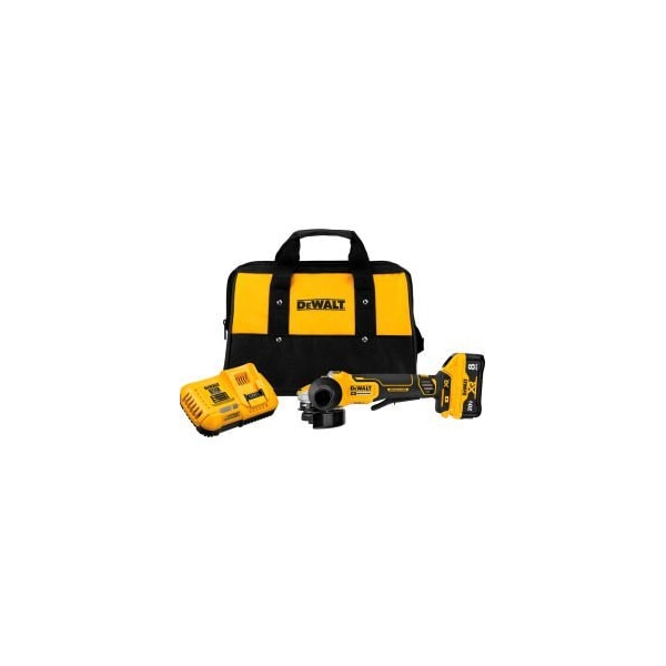 The DEWALT DCG415W1 20V MAX XR Switch Small Angle Grinder Kit is a cordless angle grinder intended for use in a variety of applications. Featuring POWER DETECT Tool Technology, this tool adjusts output based on battery capacity to deliver increased performance. The brushless motor rated at up to 1,350 max watts out and speeds up to 9,000 rpm. This kit includes an 8Ah battery, charger, and storage bag for portability.